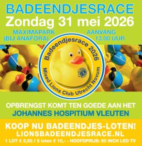 De Mixed Lions Club Utrecht Novum organiseert elk jaar een badeendjesrace in het Maximapark bij Anafora. De opbrengst komt dit jaar ten goede aan het JHV. Daar zijn we natuurlijk ontzettend blij mee. Voor die badeendjesrace worden er loten verkocht en kun je dus ook mooie prijzen winnen. Bestel via deze link direct je loten!